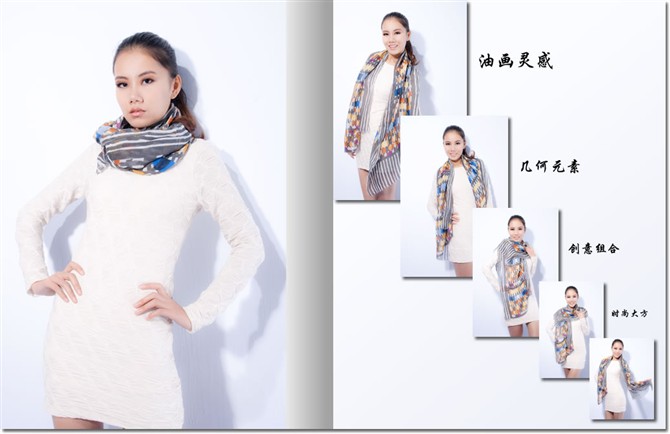 这款套装的搭配风格显得非常的精致唯美,水墨画设计风格的围巾更是非常的大气时尚。是整款的亮点,正适合初秋季节搭配,洋气十足。